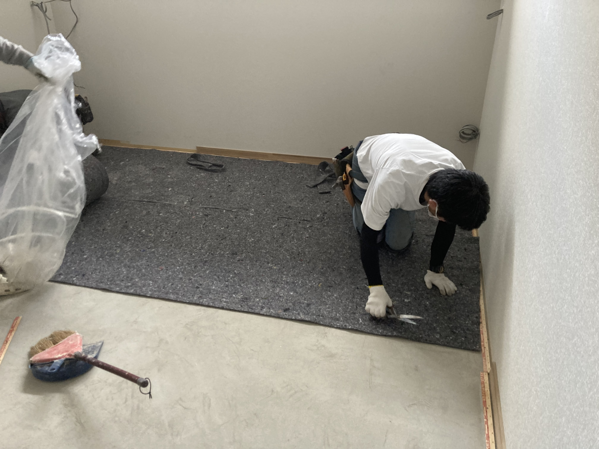 そしてクッション材を敷き込み、その上にカーペットを敷き込みます。